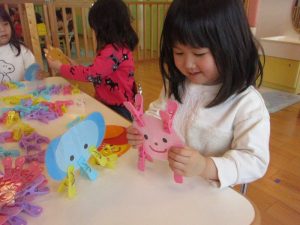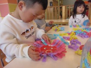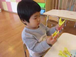 洗濯ばさみと洗濯ばさみを合わせてリボンを作っていますね