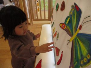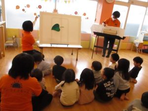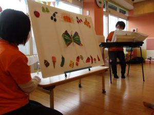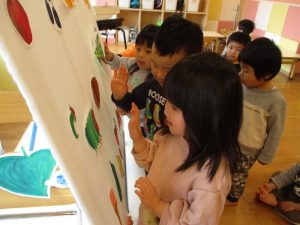 先生たちからのプレゼントは『はらぺこあおむし』のパネルシアターです![]()