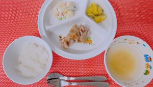 おやつの時間に友だちと元気良くお話しする声が聞こえてきました。給食を通してコミュニケーションをとれると食べるのが楽しくなりますね!!