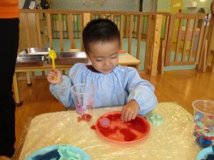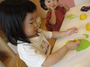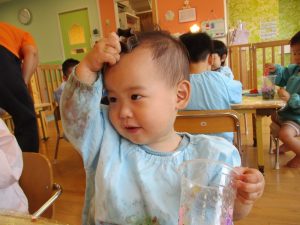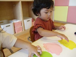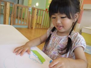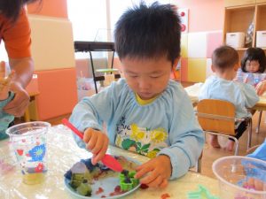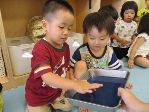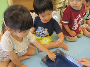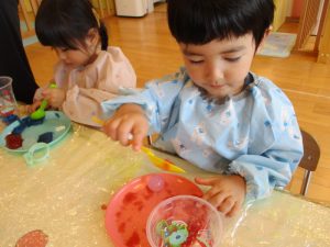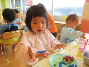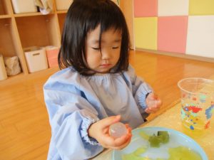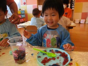 さて、先週は氷や泡で感触あそびを楽しんだ子どもたち![]()
