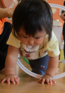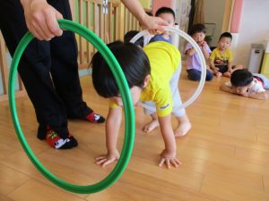 いちご組さんも、まずはフラフープのトンネルくぐりからスタートです