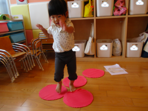 保育者の『ぐー!ぱー!』のかけ声に合わせて足を閉じたり開いたり・・