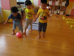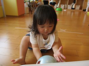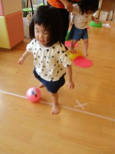 ゴールに向かってボールを転がすのですが、ボールを入れたい気持ちからじわりじわりと前に進んできます