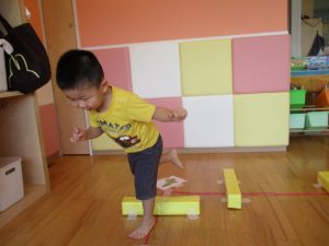 手をついたり、保育者と手を繋いだりしながら慎重に取り組んでいます