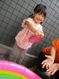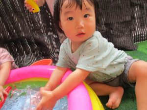 今週からお盆休みに入ったお友だちもおり、いつもより少し静かな保育園ですが、子どもたちは気持ち良さそうに水あそびを楽しみ、元気いっぱい過ごしています