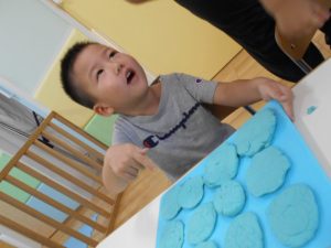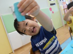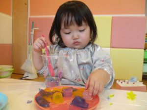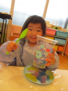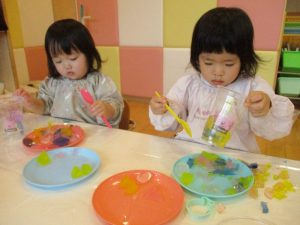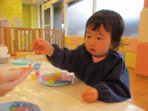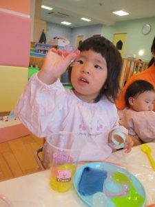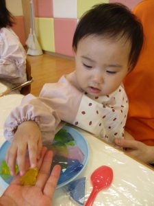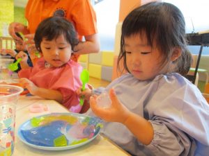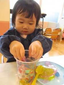 ぎゅっと握って寒天の感触を楽しむお友だちもいれば、壊れないようにそっと手に取るお友だちも![]()