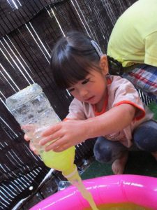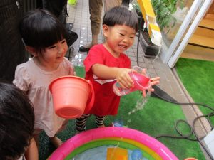 初めは怖がっていたお友だちも、徐々に慣れ、顔に水がかかってもお構いなしの様子で遊んでいます![]()