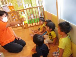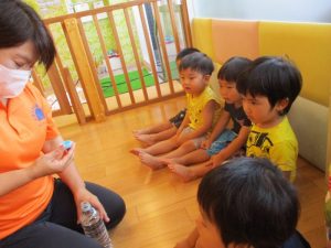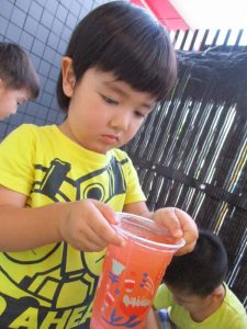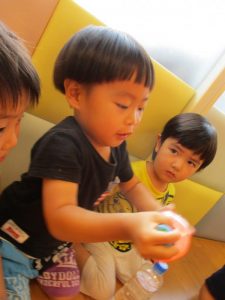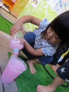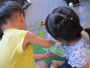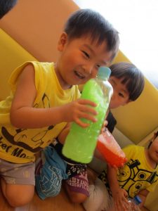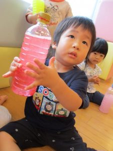 保育者がペットボトルに水を入れて準備をしている時から『なに??』と興味津々の様子だった子どもたち![]()