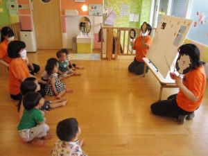 先生たちからのプレゼントは『くいしんぼうの おばけのこ』のパネルシアターです![]()