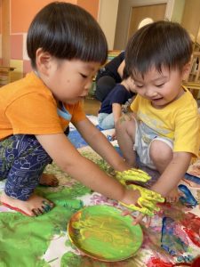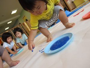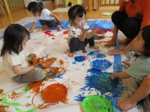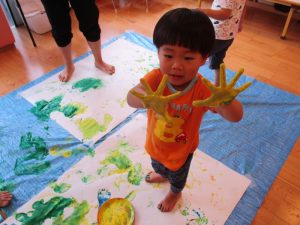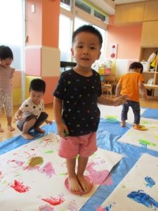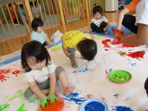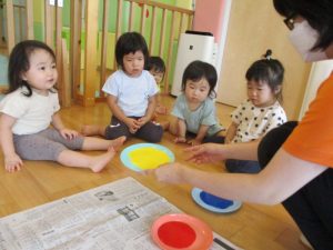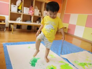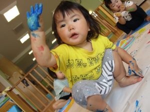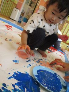 今回は筆などの道具はなく手や足でということで、『いいの?』と遠慮がちに絵の具を触るいちご組さん