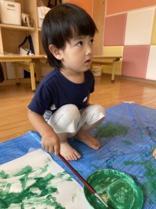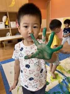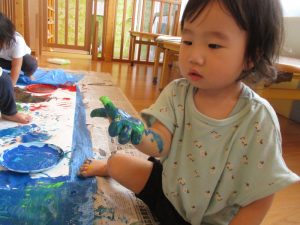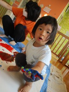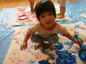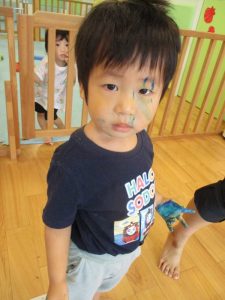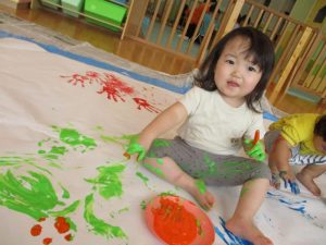 いちご組さんに比べて思い切りのよさがあり、終わる頃には体のあちこちや顔に絵の具が