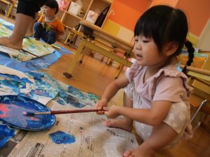 先日、読み聞かせブログでも紹介した『いろいろいろのほん』を見た後ということもあってか、お皿の中や模造紙の上で色を混ぜているお友だちもいました