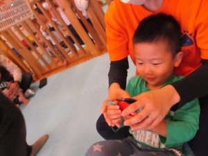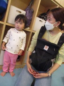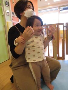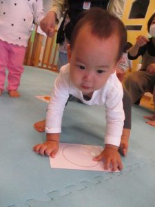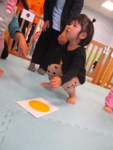 いつもはノリノリの音楽が始まってもひっつきもっつきな子どもたちでしたが、お母さんの『行ってごらん』の一言で一歩踏み出す姿に頼もしさも感じましたね![]()