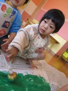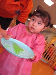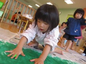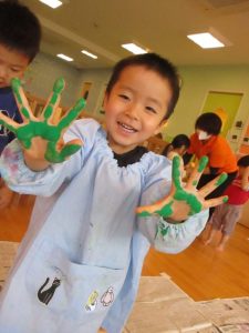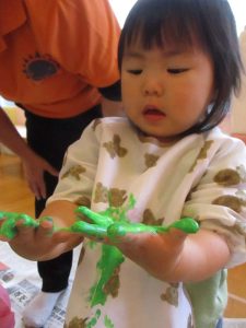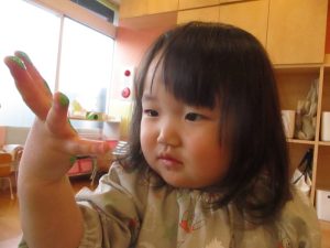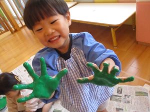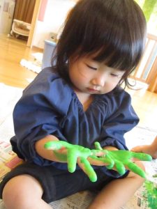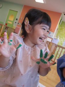 自分やお友だちの手が緑色に染まっていく様子に笑いが止まりません![]()