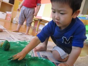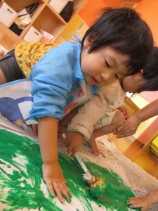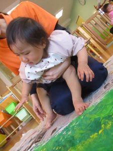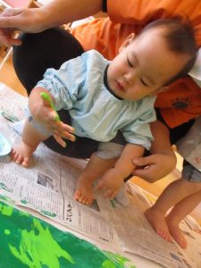 まだ絵の具の感触に慣れていないこともあり、後ずさりするお友だちもいましたが、先生と一緒にそれぞれのペースで製作に参加することができました![]()