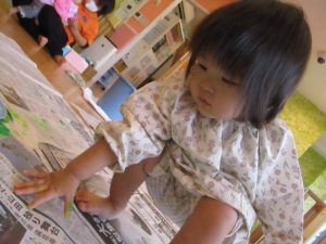 色々な絵の具あそびやボディペインティングを経験してきたりんご組さんは最初からダイナミック![]()