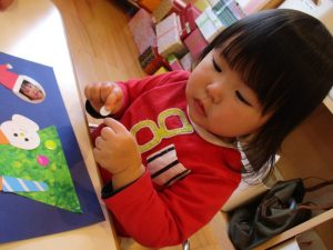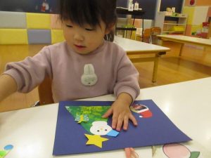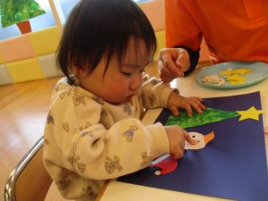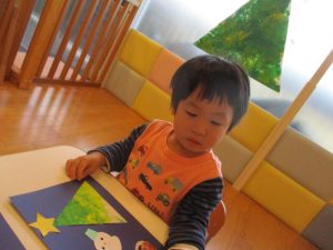 みんなで作ったクリスマスツリーを分けっこし、一人ひとりのクリスマスツリーを作りました