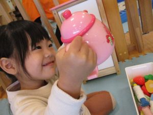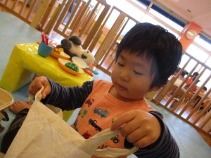 かばんを持ってお買い物をしたり、テーブルにご馳走を並べたり、イメージを膨らませながら遊ぶ姿からは、お母さんやお父さんの姿をよく見ているんだなぁということが伝わってきます