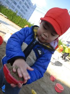 砂をぎゅっぎゅと詰めて、型抜きも工夫しながら遊べるようになりました