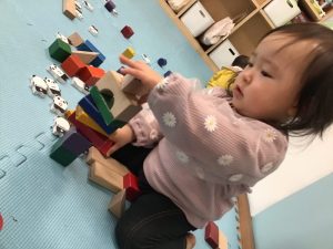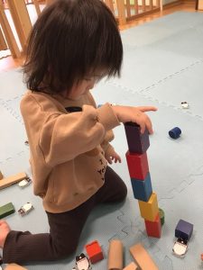 先生の真似をして積み重ねたりパンダを並べたり・・