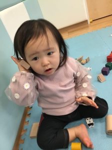 長い積み木を電話に見立てて・・