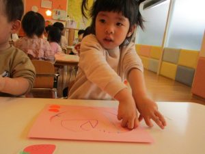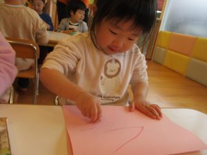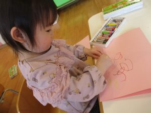 14日はバレンタインデーということで、ハートにくり抜いてある色画用紙に好きな色でグルグルお絵描き![]()