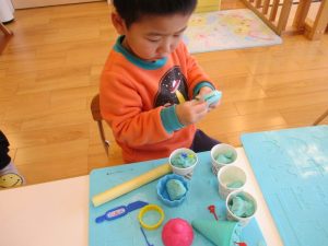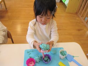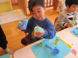 この日はアイスのコーンやクッキーの型抜き、スプーンなど色々なおもちゃを使って遊びました![]()