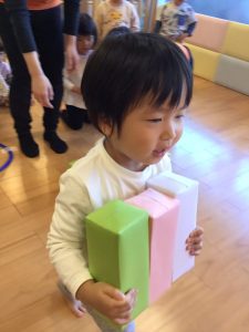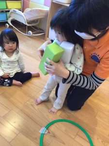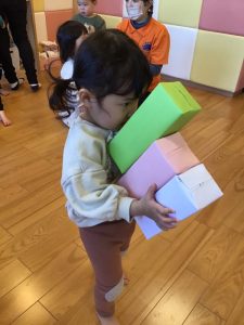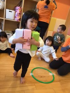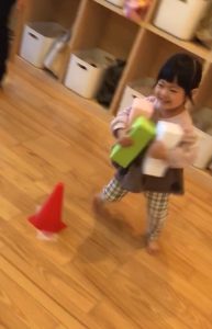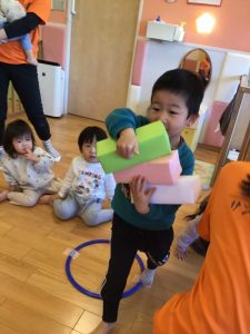 二手に分かれ、フラフープが置いてあるところまで運ぶのですが、落ちないようにとぎゅっと抱きしめるお友だち・・