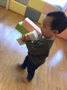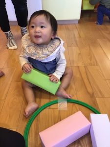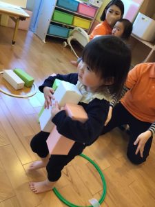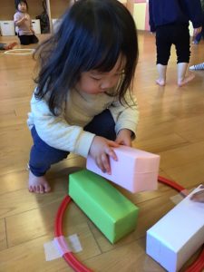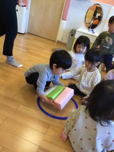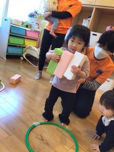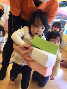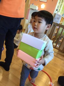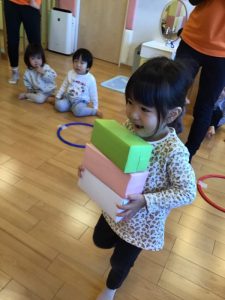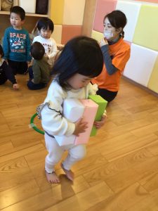 牛乳パックで作った白・ピンク・黄緑の箱をひし餅に見立てて『ひし餅運びゲーム』です![]()