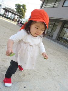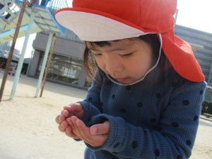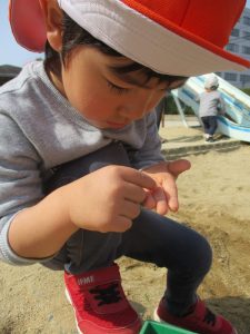 手にひらに乗せたり砂場のおもちゃに入れたりしてじっくり観察し、丸まっているだんごむしには『起きて〜!!』と声をかけていました![]()