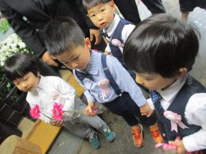 卒園式当日、『おうちの人にありがとうのお花を渡そうね』と子どもたちと買いに行きました![]()
