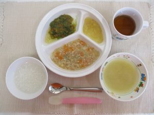 粥 味噌汁(キャベツ) じゃが芋のそぼろ煮 きゅうりと人参のおかか煮 煮りんご