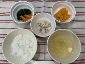 粥 味噌汁(玉ねぎ・さつまいも) 煮魚(たら) 小松菜だし煮 かぼちゃの甘煮