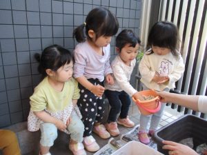 『りんご組さんはお仕事があります!!』『お手伝いしてくれる人??』と言うと『はい!!』『いいよ!!』と頼もしい言葉が返ってきました![]()