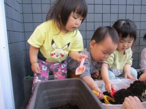 魔法の粉(肥料)を混ぜた土をプランターに入れていきます![]()