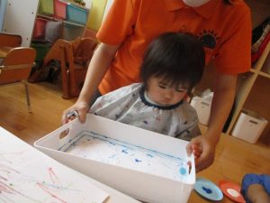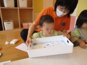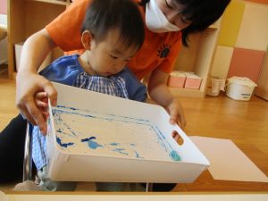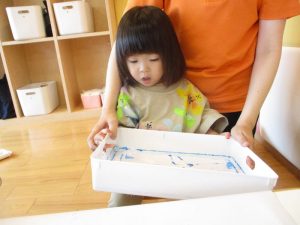 ビー玉が転がる様子や転がってできる模様に興味津々![]()