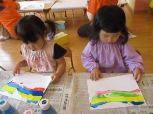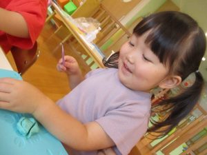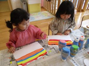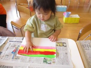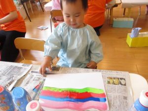 好きな絵の具を選び、牛乳パックの切れ端を使って伸ばすと・・