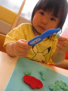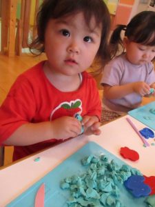 初めて油粘土で遊んだ時には『固い・・!』と少し難しそうにしていた子どもたちでしたが、好きな大きさにちぎったり手のひらでこねたり、ヘラや型抜きを使いながら形を変えることを楽しんでいました![]()
