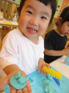『粘土するよ~!』と伝えると、『アンパンマン作りたい!』『パン作る!』と作りたいものが次々と浮かんでくる子どもたち![]()