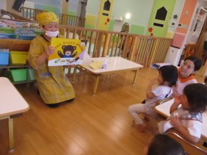 今回は手洗いの大切さを伝えるため、給食先生が紙芝居を持って来てくれました![]()
