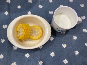 おやつのゆでとうもろこしを触ったり、かじったり、手で剥ぎ取ったりと様々な個性がありますね♪