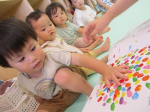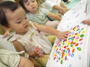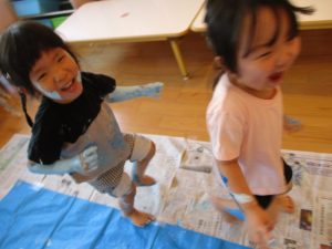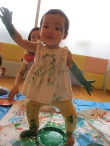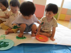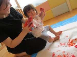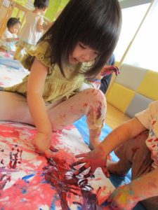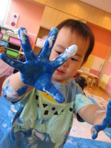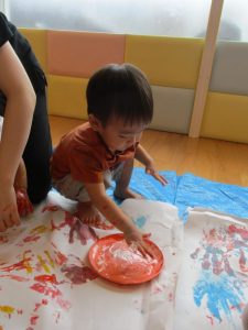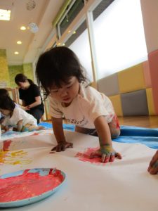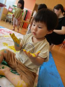 大きな模造紙に手形をつけたり、絵の具の色を混ぜたり・・