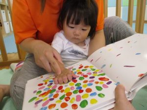 絵本に手を乗せて、