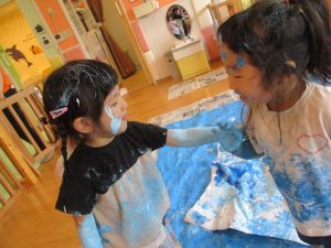 先生の腕や服にもお構いなしで絵の具をつける子どもたち![]()