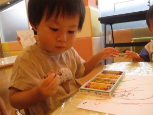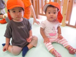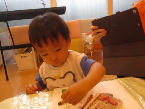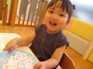 今週のフラッシュカードや『英語で遊ぼう』のテーマが色ということもあってか『あお!』『あか!』と保育者に色を知らせようとする姿も見られました