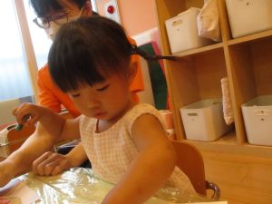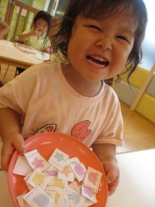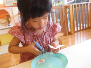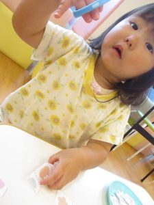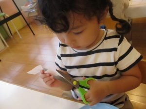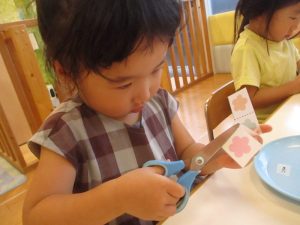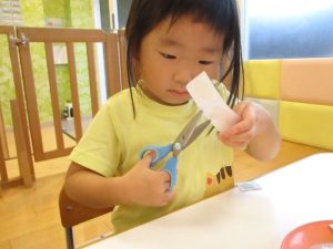 りんご組さんは敬老の日の製作をした際に『まだ切りたい!』『チョキチョキしたい!』という声があり、今回は点線を目印に切ってみました
