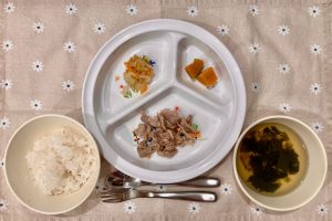 (写真は普通食になります。年齢によって盛り付け量を変えて、提供しています。)