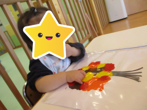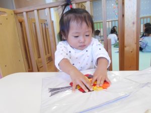絵の具を置いた画用紙をジップロックに入れて、指で伸ばしたり押さえたり感触を楽しみました![]()