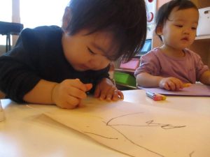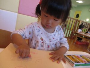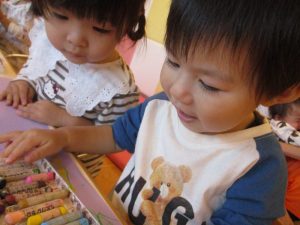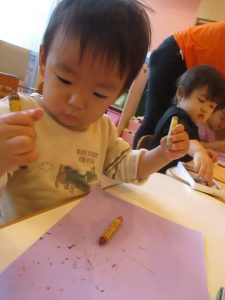 『どんな色が好き?』のうたに合わせて好きな色のクレヨンを選び、のびのびと手を動かす子どもたち![]()