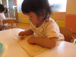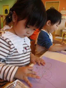 線や丸を描いているお友だちもいれば『トントントントン』とリズミカルな音をさせながら点を描くお友だちもいました![]()